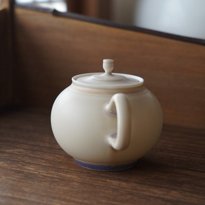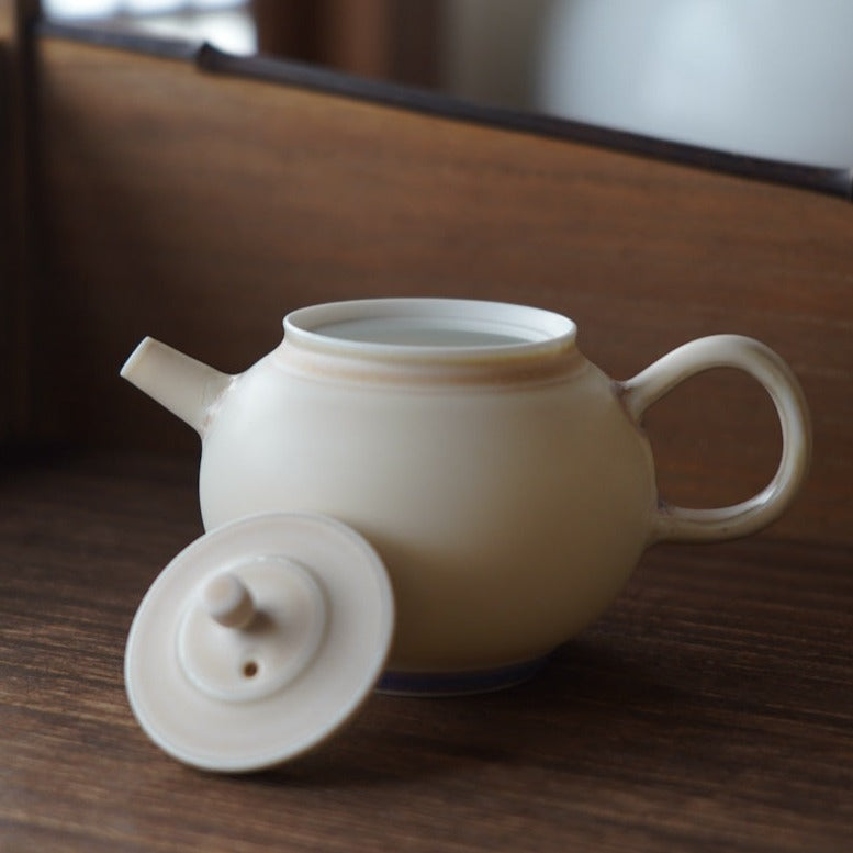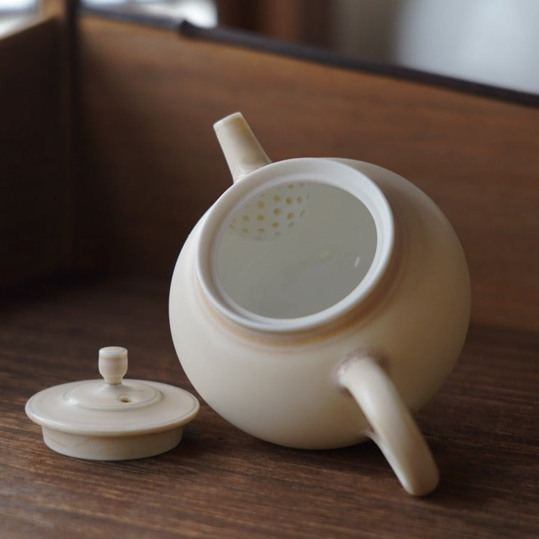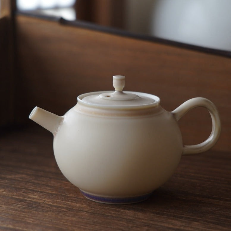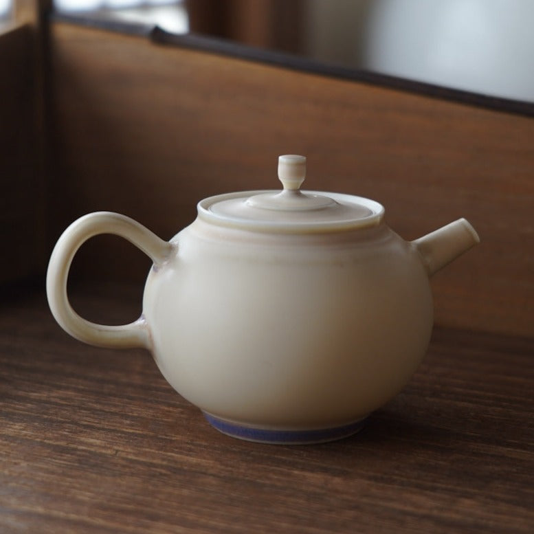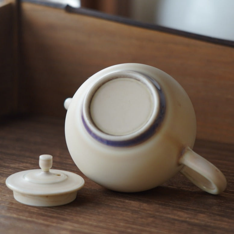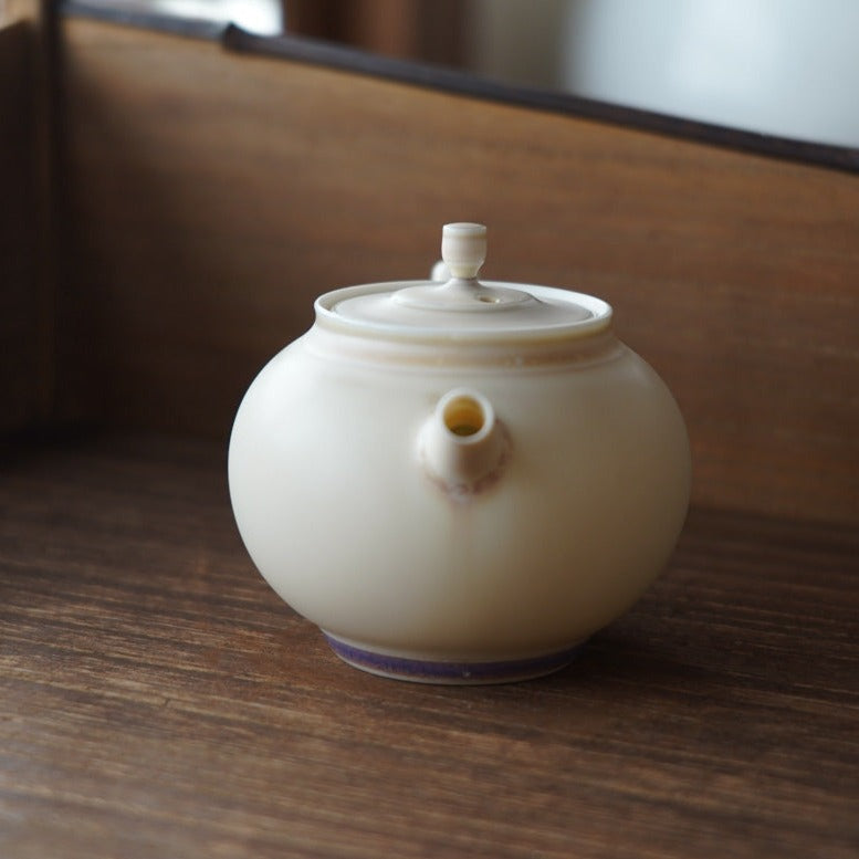 胎體為白瓷,釉色為蛋殼釉窯變淡淡粉色,壺底紫色流釉獨特,內蜂巢球孔出湯過濾茶葉渣